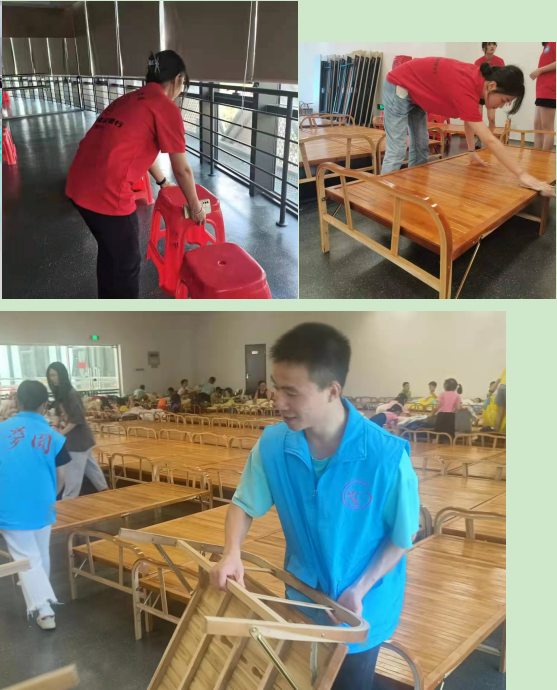 图为小队成员对学生住宿地的清扫,以及对午休床的搬运与清扫、晾晒