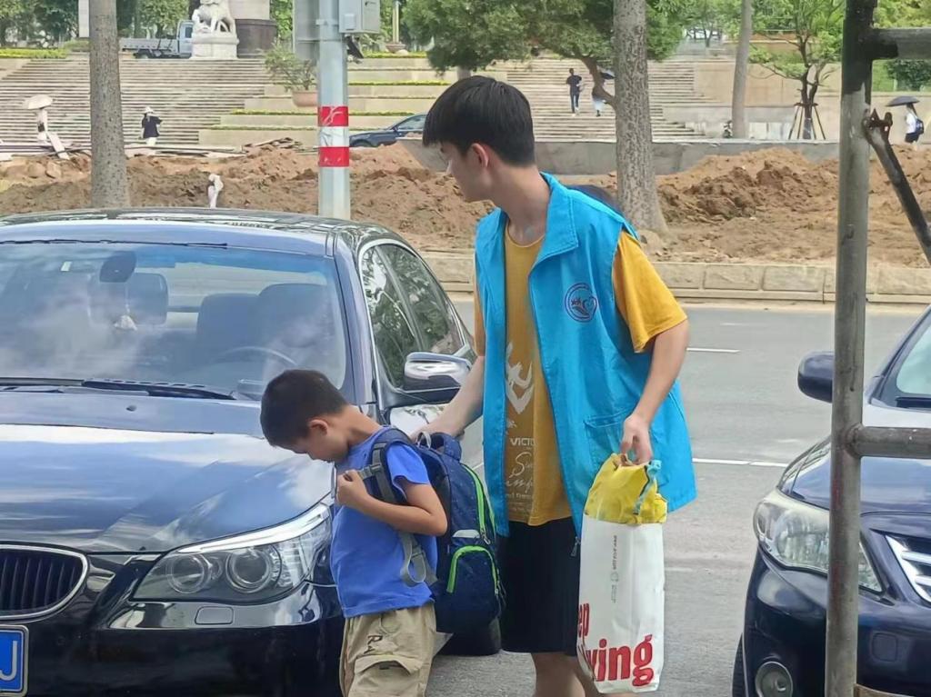 志愿者们换上志愿服在正大门处、侧门处、以及公交站迎接着新生的到来,帮助他们携带行李并带领他们前往各自的班级,找到各自的老师。