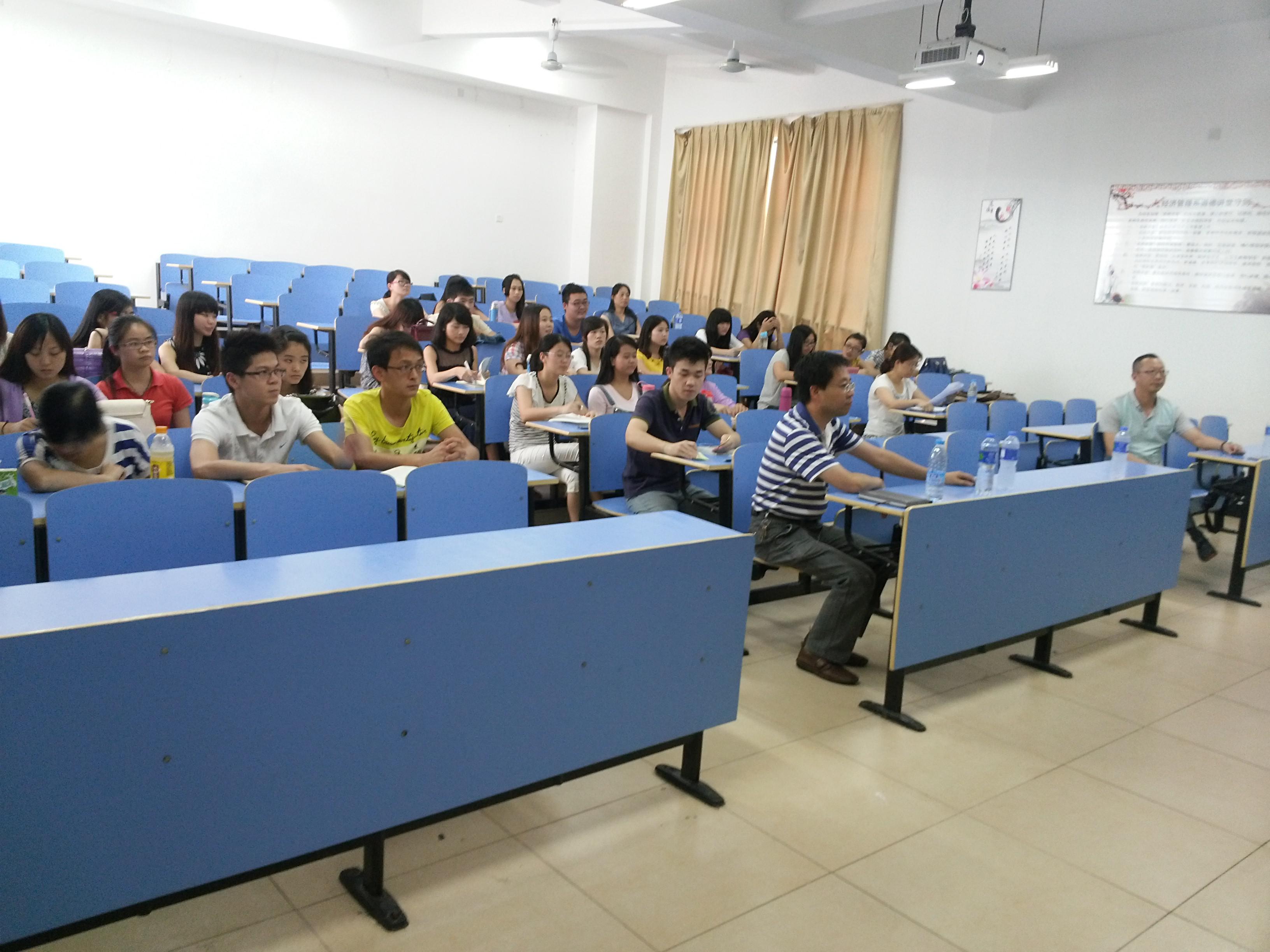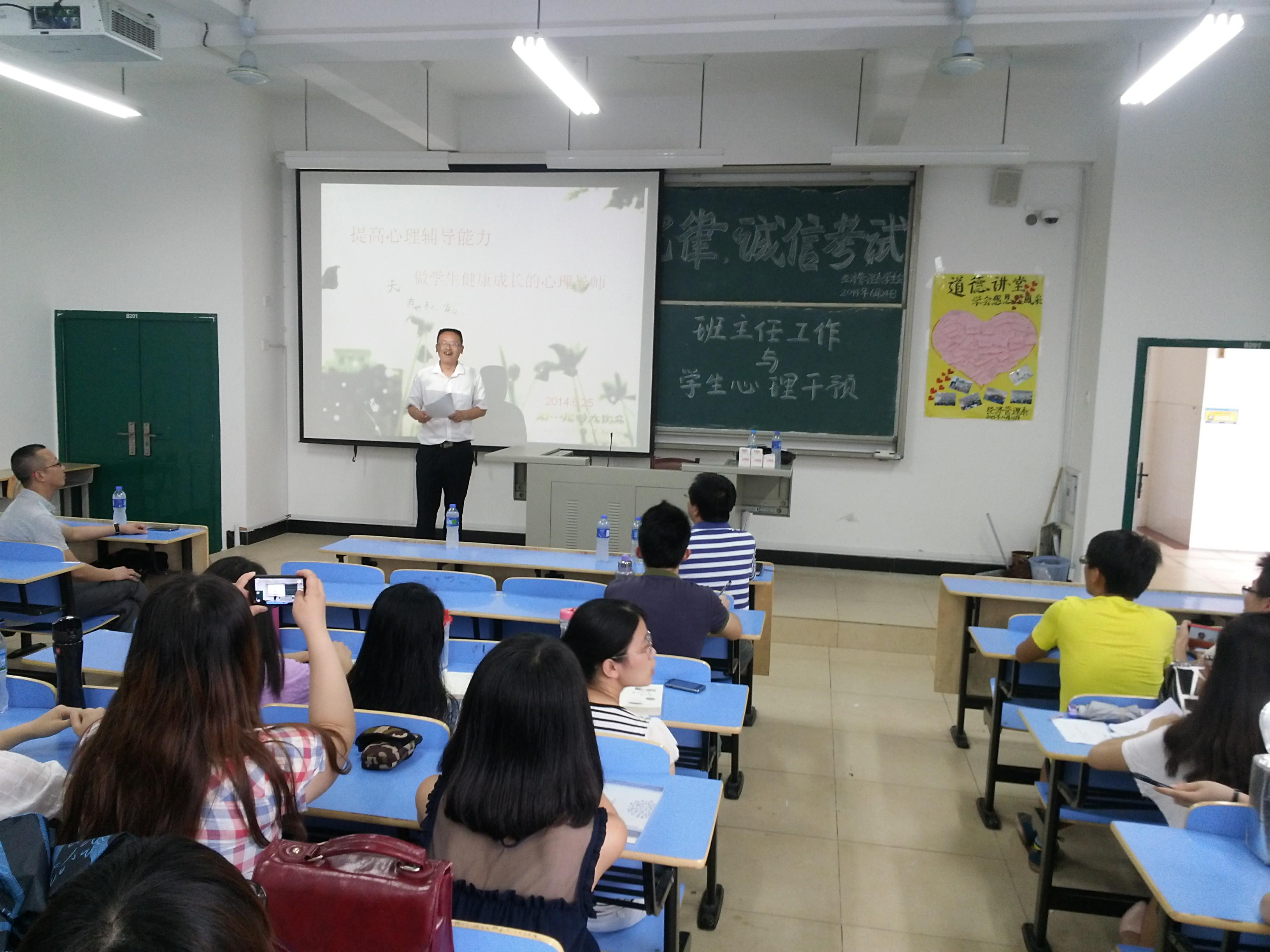 为了帮助我系即将实习的学生了解班主任的工作并且能在今后成为一名合格、优秀的班主任。2014年6月25日我系在BB201举办了主题为“班主任工作与学生心理干预”的讲座,邀请了宁德市屏南华侨中学副校长、高级教师张长武作为主讲人。经济管理系党总支书记游国斌、经济管理系党总支副书记周建辉、江容眉等老师以及我系即将实习的学生到场参加。本次讲座由游国斌教授主持。
