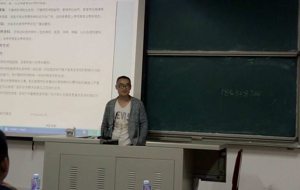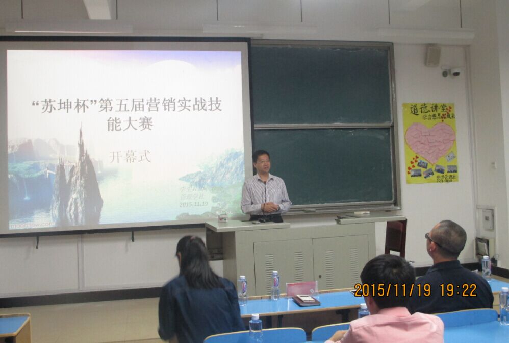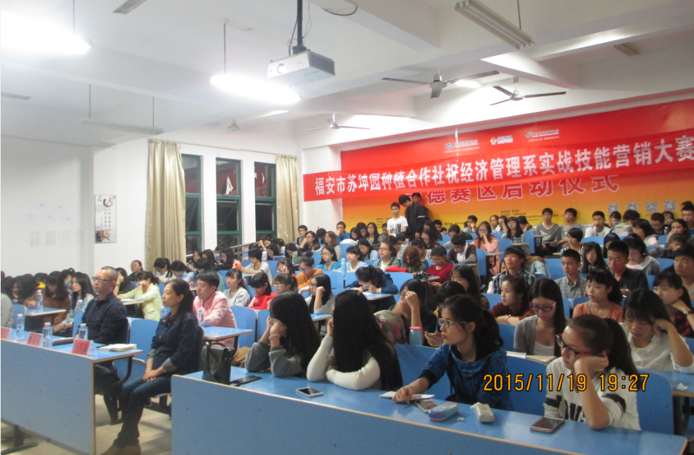 2015年11月19号晚上7点,宁德师院管理学社于求真楼BB201举行了宁德师范学院第五届“苏坤杯”营销实战技能大赛的开幕式。本次开幕式邀请到了经济管理系党总支书记兼系主任游国斌教授、经济管理系党总支副书记周建辉老师、经济管理系教研室主任游天嘉老师等。此外,福安市苏坤园种植合作社的相关负责人苏树斌总经理等人也出席了本次开幕式。