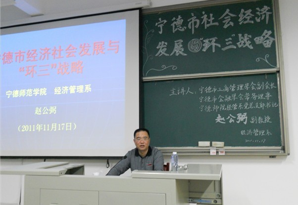 2011年11月17日晚上7点,求真楼B区101教室迎来了一场主题为“宁德市社会经济发展与‘环三’战略”的精彩讲座。福建省科学社会主义学会常务理事、宁德市工商管理学会副会长、宁德市金融学会常务理事、宁德师范学院经济管理系党总支书记赵公弼副教授带领在座师生进行了一次发展与未来之旅。讲座主要围绕宁德市社会经济发展与“环三”战略的由来进行分析。其中,涉及到宁德人文历史,海湾独特,资源丰富等一系列区位优势。赵书记联系实际,分析了“环三”战略的效应和意义,特别针对宁德崛起的重大意义进行了重点分析。赵公弼书记生动的讲授和图文并貌的PPT不仅深深吸引了现场师生的注意力,更为同学们带来思想上的冲击和灵魂上的震撼。讲座不仅表达了宁德市社会经济发展远景,展望了宁德未来“环三”的发展战略,同时也体现出主讲者的眼光和胸襟,旨趣和姿态。讲座把象牙塔塔的专业研究带入公众的生活当中,弘扬人文精神。最后,由我系游国斌教授对此次讲座进行了总结,强调了“环三”战略对宁德市社会经济发展的重要性,对宁德未来的发展前景做出了肯定。