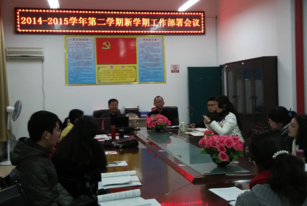 2015年3月3日,经济管理系召开新学期工作部署会议,全体教师参加会议。会上,系主任、系党总支书记游国斌首先通报了学期初教师和学生的报到情况。重点传达了学院江小源书记在“2015年学校工作部署”会议上的讲话精神,从深入学习贯彻习近平总书记系列重要讲话精神,用中央精神指导学校工作;深入贯彻落实十八届三中全会精神,全面深化学校综合改革;深入学习贯彻十八届四中全会精神,全面推进依法治校;落实目标管理责任书的目标任务,全面提高内涵建设质量;坚持全面从严治党,加强学校党建工作等五个方面展开说明。同时,系主任、系党总支书记游国斌指出,经管系全体教师应紧紧围绕学校总体工作部署方针,根据经济管理系自身专业特点,锐意进取,勇于担当,领取任务,积极做好课改项目,申报新型课程,积极承当各类课题,不断提高专业课程建设水平,为本科评估做好准备。