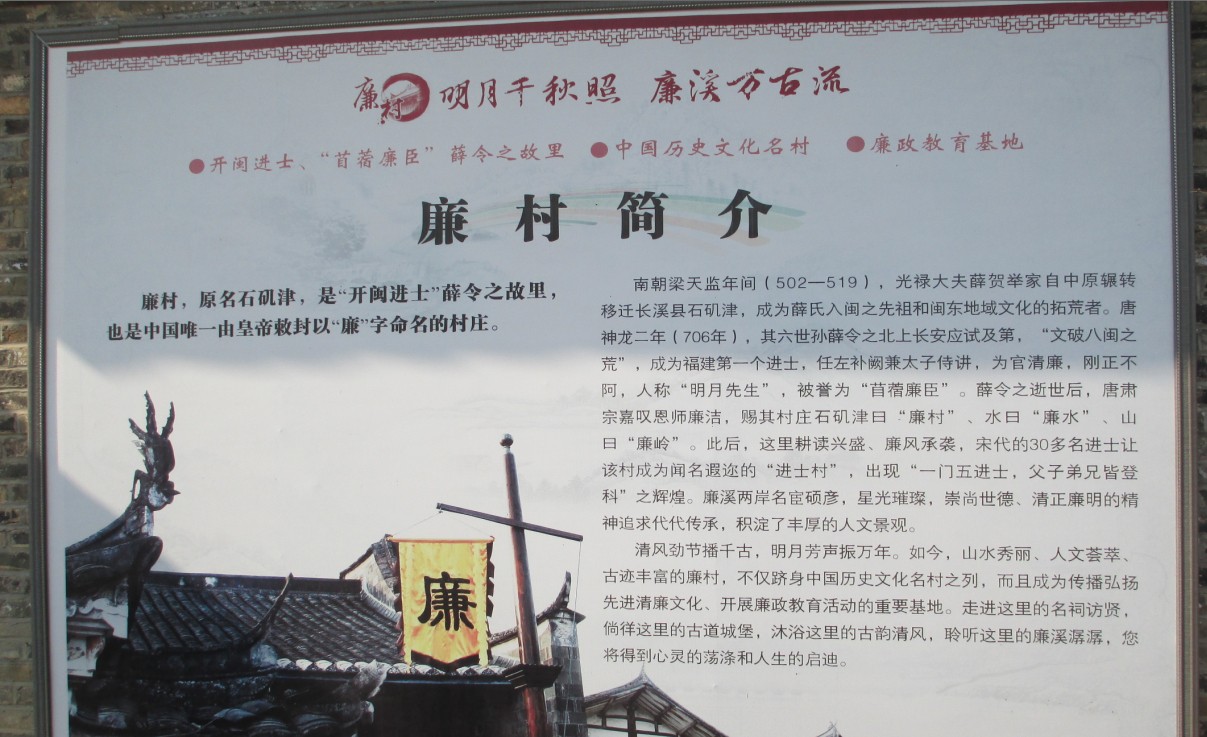 廉村原名石矶津,是开闽第一进士薛令之的故里,因其为官清廉,皇帝敕其乡为“廉村”,水为“廉溪”,山为“廉岭”,该村成为了教育干部学廉、知廉、倡廉的廉政教育示范基地。
