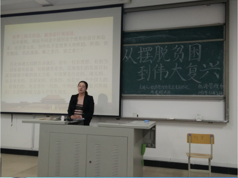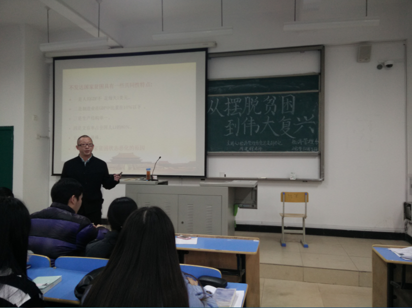 迎接一年一度的学校科技活动月,同时深入贯彻习近平同志的执政理念,经济管理系党总支副书记周建辉于2015年12月3日下午两点十分在求真楼Bb301给全系师生作了一场题为“从摆脱贫困到伟大复兴”的专题讲座,出席本次讲座的有经管系教师以及百余名学生。
