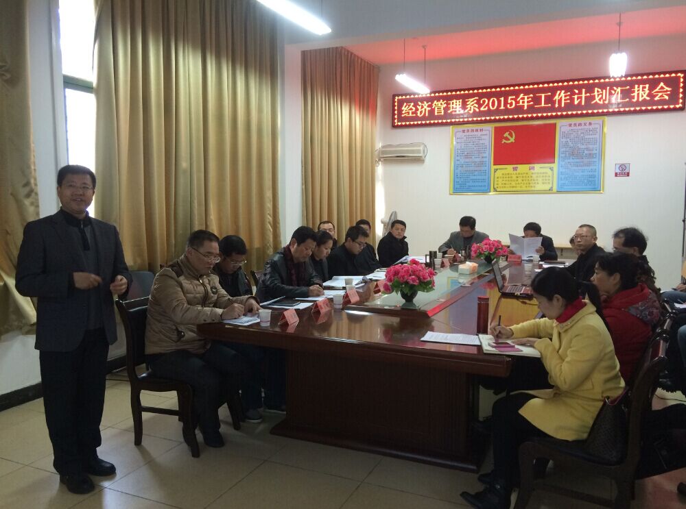 2015年3月9日,经济管理系召开2015年工作计划汇报会议,校党委书记江小源、校长林跃鑫、校党委副书记张星、副校长谢向东、各部门领导代表,以及经济管理系全体教师参加会议。