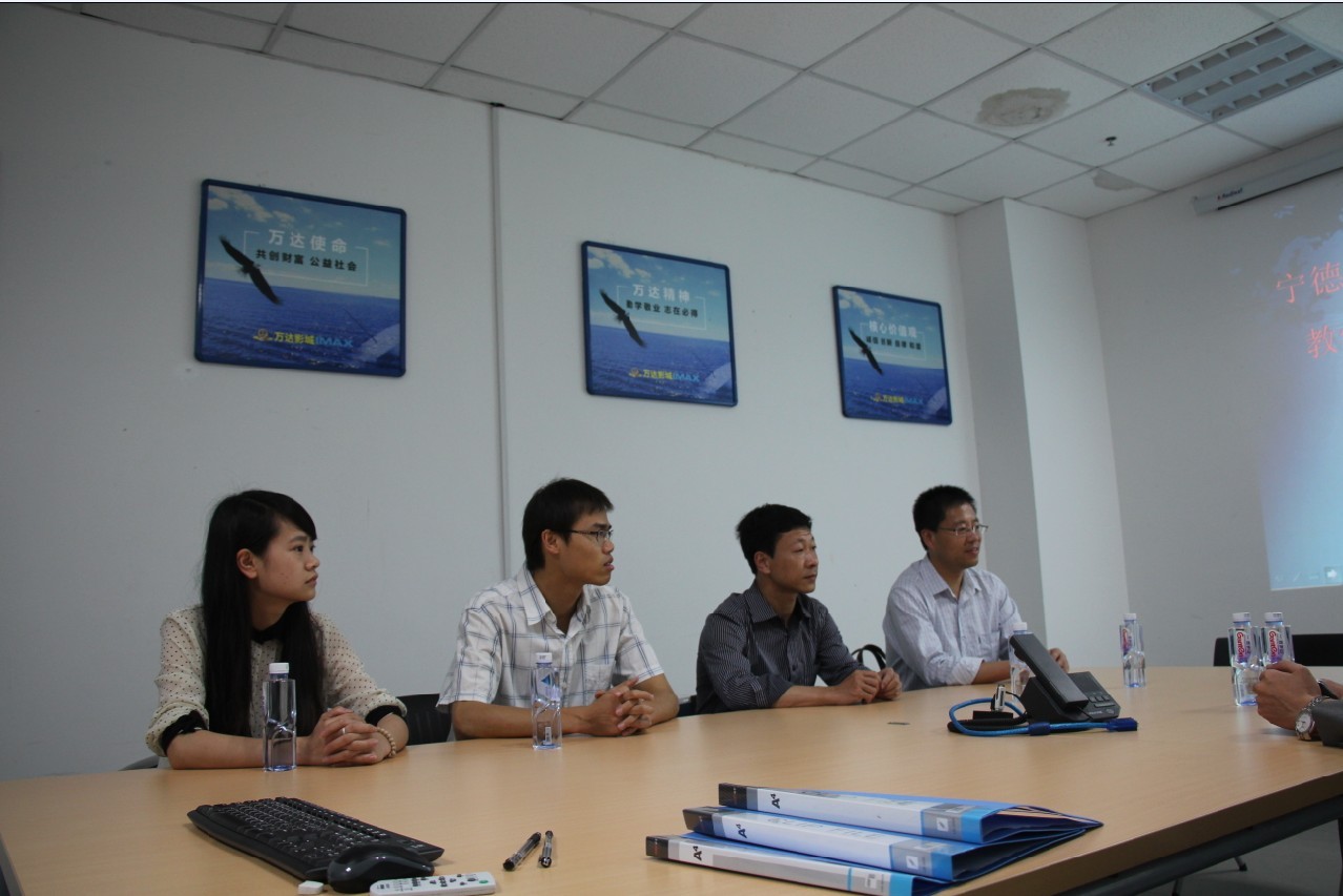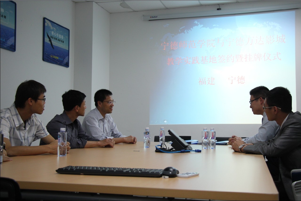 5月14日下午,在宁德万达影城会议室举行了宁德师范学院设立宁德万达影城教学实践基地的签约暨挂牌仪式。参加签约挂牌仪式的有宁德师范学院经管系党总支书记游国斌教授、经管系办公室主任龚梓兵老师、经管系学生党支部书记储苏凯老师、经管系专任教师屠晶鑫、万达影城总经理邓志强先生、万达影城客户经理郑石铃。签约仪式前,游国斌教授与邓经理就落实教学宗旨、提高学生实践能力、展开校企合作等交换了意见,希望通过此次签署协议,进一步开展深层次合作,共同发展,实现双赢。随后,双方签订了《宁德师范学院教学实践基地建设协议书》,并在影城挂上“宁德师范学院教学实践基地”标牌。