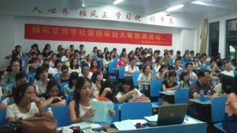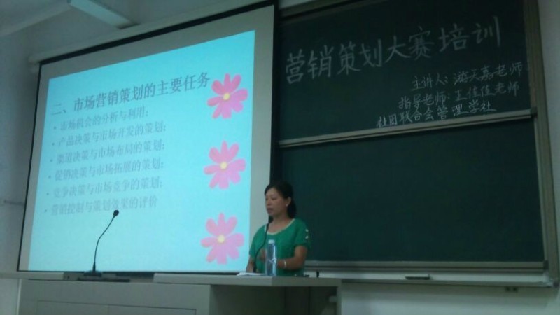 2013年10月9日晚7点,经管系的管理学社在BB301开展第三届宁德师范学院营销实战技能大赛的赛前培训。出席此次活动的有经管系马忠达、游天嘉、王佳佳三位老师,宁德奇隆翔农业有限公司总经理周倩敏女士。参加本次活动的还有管理学社社员及23支参赛队所有成员。此次活动由管理学社新一届社长李跃发主持,王佳佳老师代表讲话并提出几点期望,游天嘉老师对大家进行培训,最后由周总经理周倩敏女士向大家介绍产品总类及其功效。整场活动历时2个多小时,在自由提问环节,同学们还就各自感兴趣的话题与周总进行了探讨。