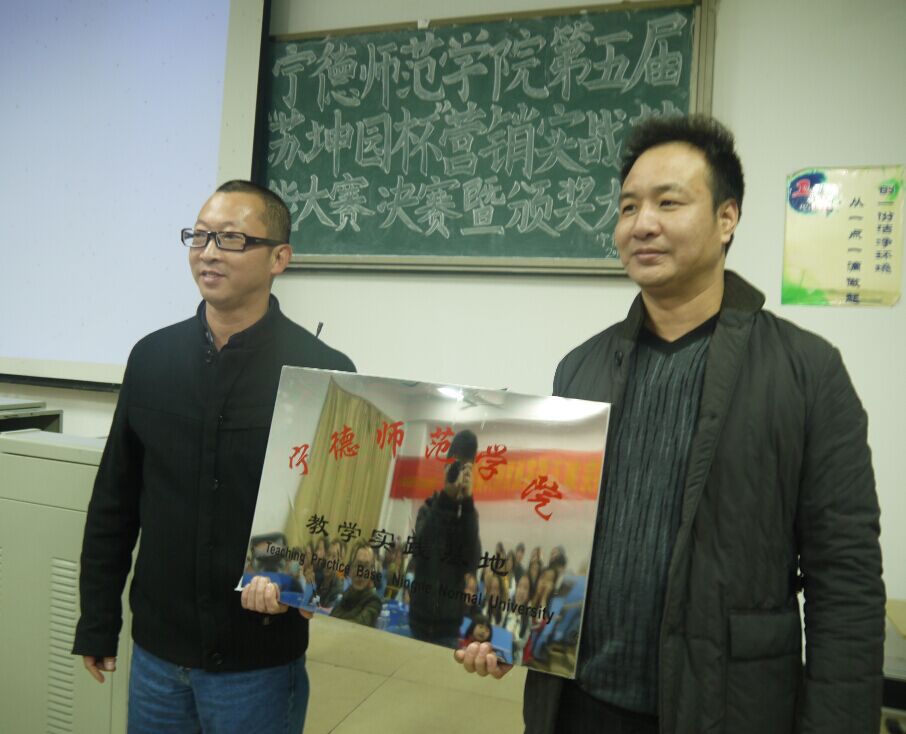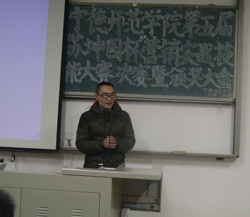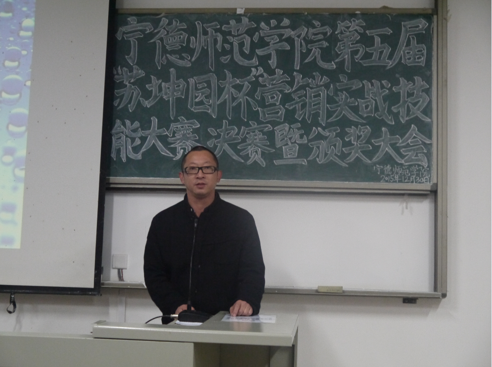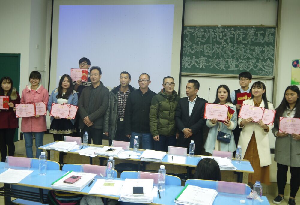 2015年12月30日晚7点,在宁德师范学院新校区求真楼bb101举行宁德师范学院第五届“苏坤园杯”营销实战技能大赛决赛暨颁奖大会。出席本次大赛的有经济管理系党总支副书记周建辉老师、福建师范大学数学系教授闽南驻宁德商会会长吴光起先生、经济管理系市场营销教研室主任兼管理学社指导老师游天嘉老师、经济管理系团总支书记王佳佳老师、经济管理系党总支秘书周俪老师、专职辅导员杜艳芳老师、以及区供销社电商运营中心主任余赋主任、福安苏坤园种植专业合作社总经理苏树斌先生、宁德九羽联合企业管理服务有限公司董事长——周日亮先生、蕉城新合作电子商务有限公司总经理宋建安先生,还有众多的参赛选手。