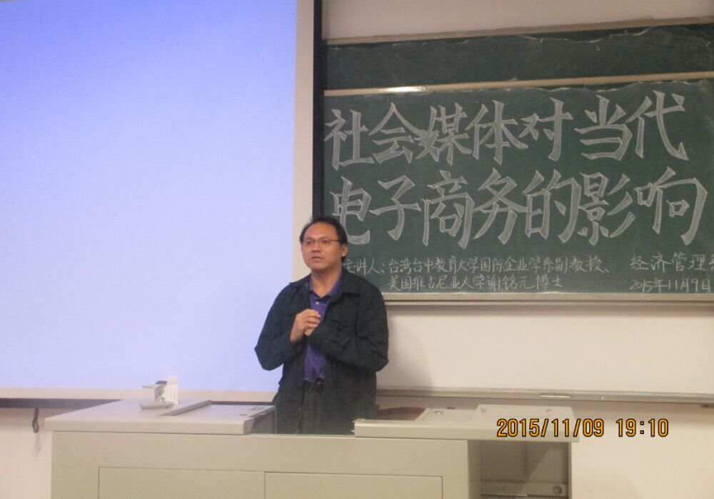 2015年11月9日晚7点,台湾国立台中教育大学国际企业学系副教授、美国维吉尼亚大学工商管理博士谢铭元莅临经济管理系,在求真楼为经济管理系师生召开题为“社会媒体在当代电子商务中的应用”的学术讲座。经济管理系党总支书记兼系主任游国斌教授、计算机系系主任张庭政教授及经济管理系师生150多人参加讲座,经济管理系党总支副书记周建辉主持讲座。