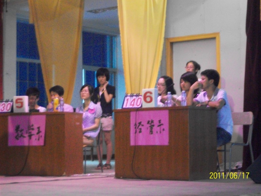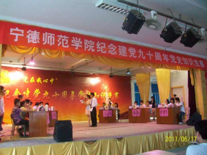 今年是中国共产党建党90周年,为了纪念党90周年华诞,加强对师生的教育引导,在校内唱响时代主旋律,营造健康向上的良好氛围,我校于2011年6月17日下午在学术报告厅举行了“建党90周年党史知识竞赛”决赛。决赛共有6支队伍参加,主持人以必答题,抢答题,选答题等方式,向各支队伍提出关于党史的问题,选手们积极作答。竞赛题目深情回顾了党的奋斗历史,热情畅谈党的光辉业绩。