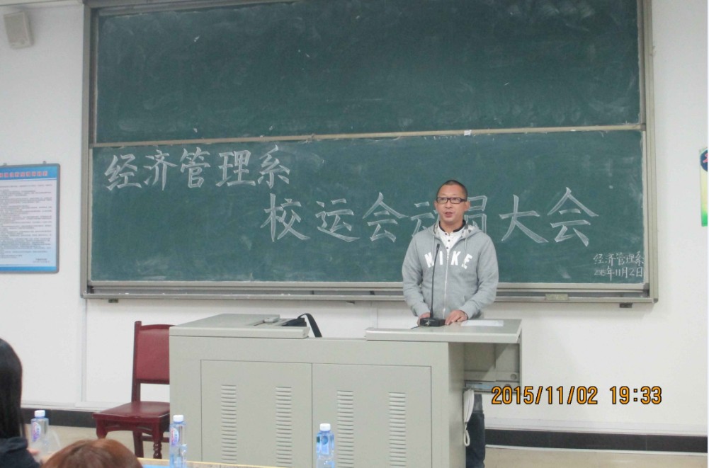 在运动会将到来之际,为充分调动运动员的积极性,同时保障运动会期间各项服务工作有序进行。2015年11月2日晚7:30,经济管理系校运会动员大会于求真楼Bb101成功举行。出席本次动员大会的有经济管理系党总支副书记周建辉老师、系团委书记王佳佳老师、专职辅导员杜艳芳老师以及系团委学生会和运动员全体成员。