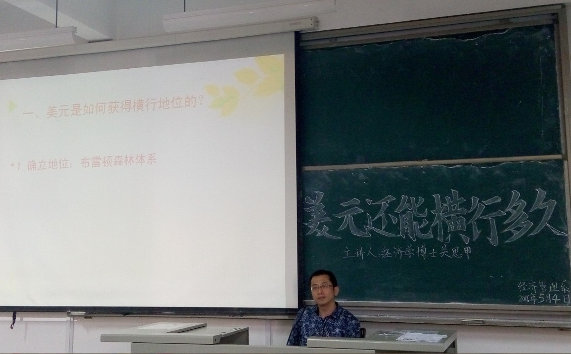2016年5月4日下午15点,经济学博士关思甲在求真楼Bb201为经济管理系师生开展了题为“美元还能横行多久”的专题讲座。系党总支书记兼系主任游国斌等19位老师及经济管理系100多名学生参加讲座。