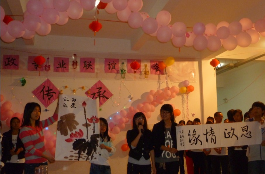丹桂飘香、春华秋实,宁德师范学院经济管理系广大师生在以赵公弼老师为首的系领导的指导与关怀下,本着弘扬新时代大学生的精神面貌、加强大学生之间文化交流、丰富经管系人文气息的宗旨,创新性地以专业为单位相继举办五场新老生联欢会,公共事务管理专业、物流管理专业、人力资源管理专业、思想政治专业和工商企业管理专业分别于10月11日、25日、27日和30日举办本次联欢会。每场联欢会由各专业三个年级共同策划和组织,从场地布置到节目编排均由学生自主完成,五场联欢会可谓好戏连台、一台更比一台好。