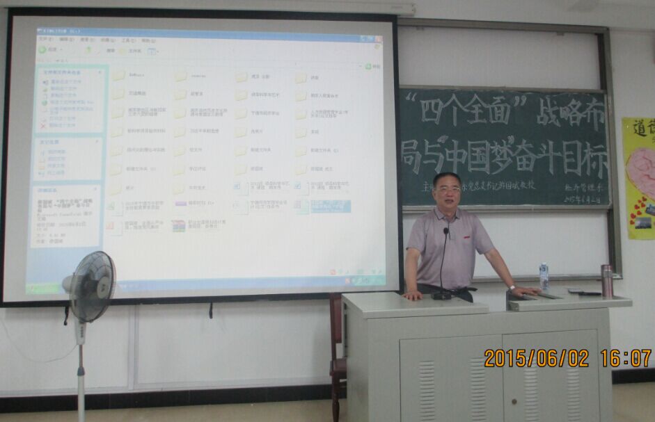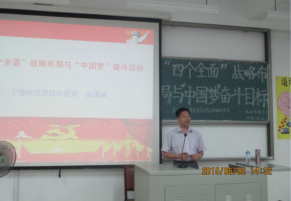 2015年6月2日下午2:30,经济管理系于新校区求真楼B区201教室开展了一场由经济管理系党总支书记兼系主任游国斌教授主讲的“四个全面”的战略布局与“中国梦”奋斗目标的专题讲座。参加本次讲座的有宁德师范学院校宣传部赵公弼部长、经济管理系党总支副书记周建辉等多名老师,以及100多名学生参加学习。