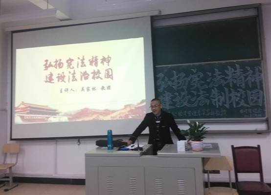 吴家林教授从了几个与宪法有关的常识性小问题,切入讲座。讲座分为四个主题——国家宪法日的提出、设立国家宪法日的重要性、典型的涉及宪法的案件以及弘扬宪法精神、建设法制校园。吴教授表示,纵观10多年来全国法制宣传日的主题,有6个与宪法有关,设置宪法日后更有助于大家从不同角度来理解宪法;宪法作为我国的根本大法,是法之统帅,法律之母,“国家宪法日”意味着是“宪法意识深化日”“维护宪法权威日”。吴教授通过剖析两个大贪官以及几个涉及宪法的典型案例,让同学们了解到要杜绝“只怕违法,不怕违宪”的模糊意识和错误观念,从而加强宪法意识。讲座最后,吴教授提到,当代大学生肩负着恪守宪法原则、弘扬宪法精神、履行宪法使命的神圣职责,我们要在校园里营造崇法、尊法、守法的氛围。