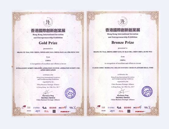 本系2015级市场营销(网络营销方向)专业学生赖橙帆、游智能,以及陈琛、韦姿妃同学,经由本系蔡尚德博士与储苏凯老师的指导,分别以“智慧型动画剧本创作产生动画系统:用于动画剧本创作教育”以及“云端趣味漫画造型产生系统:用于跨平台即时产生造型”二项发明作品参会。在面对来自于自世界各国发明项目的参赛竞争下,分别荣获大会金奖与铜奖的殊荣。