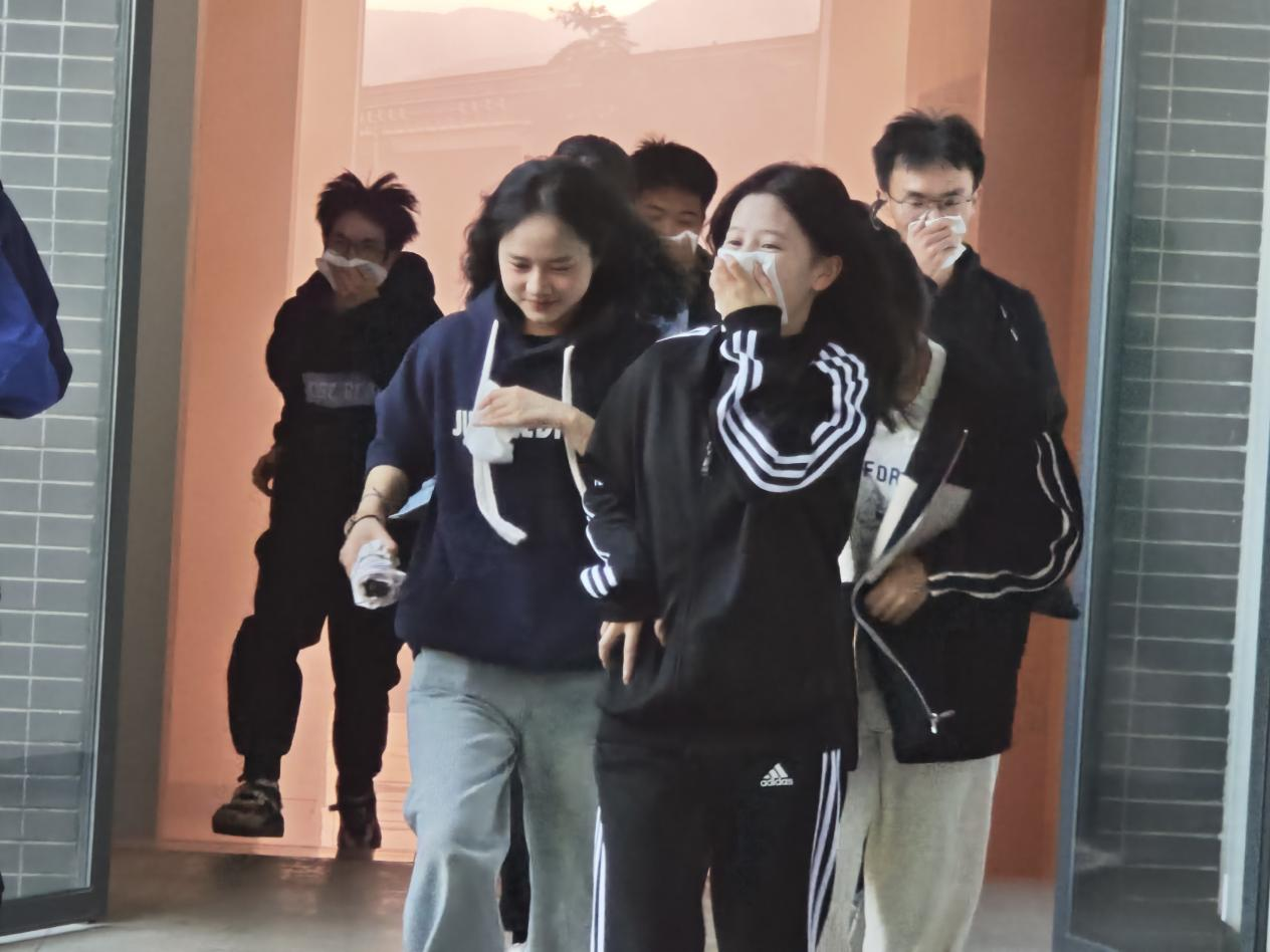 下午4点整,伴随消防应急广播,几股“浓烟”在逸夫楼实训楼滚滚升起,在各楼层应急疏散引导员的指引下,学生们手捂口鼻,低姿弯腰,按指定逃生路线有序从容地从应急疏散通道撤离。逸夫实训楼对面草坪空地上,学生们手持灭火器,对准油盆开展灭火实操体验。