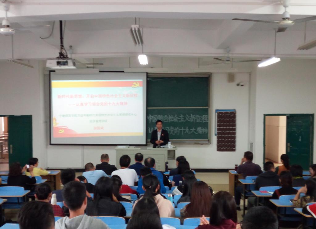 2017年11月8日下午,经济管理学院在求真楼A区301举办学习党的十九大精神宣讲报告会,宁德师范学院习近平新时代中国特色社会主义思想研究中心副主任、经济管理学院院长游国斌教授以“新时代新思想:开启中国特色社会主义新征程——认真学习领会党的十九大精神”为题作了宣讲报告。