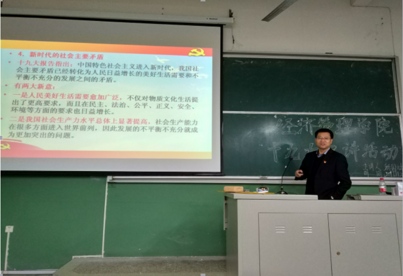 12月1日下午,经济管理学院院长游国斌教授在蕉城校区21号楼向2017级国际商务、市场营销专业全体学生宣讲十九大精神。新生辅导员杜艳芳老师主持宣讲会。