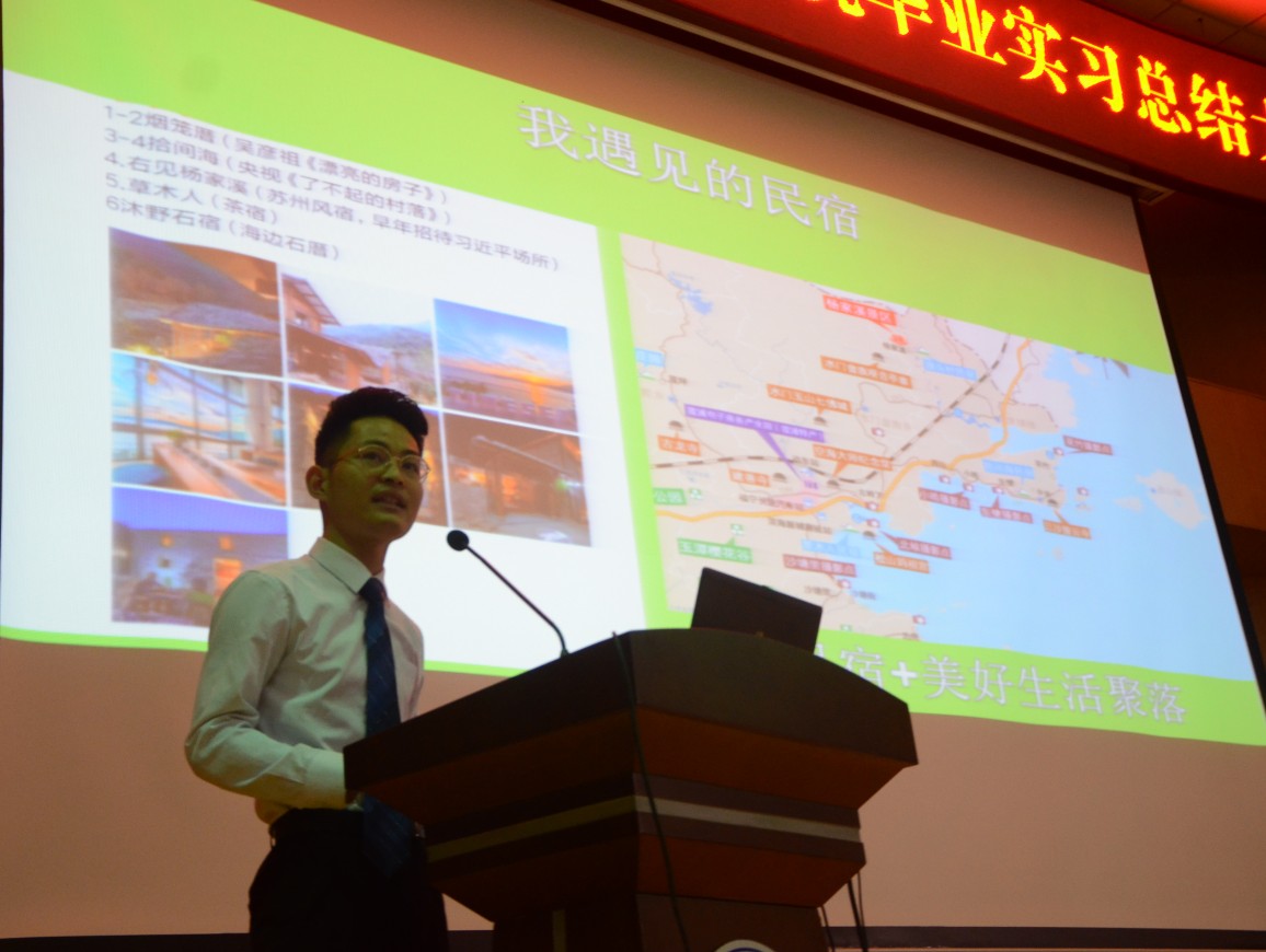 旅游管理系主任沈德福和酒店管理系主任詹岚对14级学生为期半年的实习成果做了简单的实习总结汇报。优秀实习生代表旅游管理与服务专业的陈银和酒店管理专业的施艳梅进行了实习经验分享。陈银在杭州西湖茶隐民宿实习,他主要从事线上运营和空间销售工作,不仅加深了对自媒体的理解,同时在与顾客的交流过程中提升了自己的沟通能力与人际交往能力。施艳梅在厦门五缘湾凯悦酒店实习,她主要从事前台接待工作,在实习期间完成了金砖会晤等高规格接待,得到了一定的磨练,也获得了公司的认可。他们表示在今后的成长中将虚心向前辈请教交流,努力提升自己的综合能力,鼓励学弟学妹们树立生活目标,合理规划自己的人生。