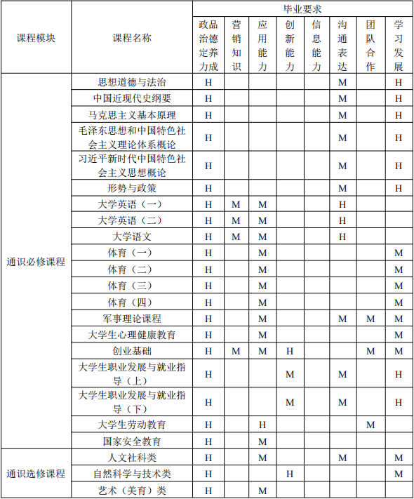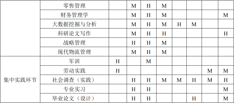 (以关联度标识,课程与某个毕业要求的关联度可根据该课程对相应毕业要求的支撑强度来定性估计,H 表示关联度高;M 表示关联度中;L 表示关联度低)