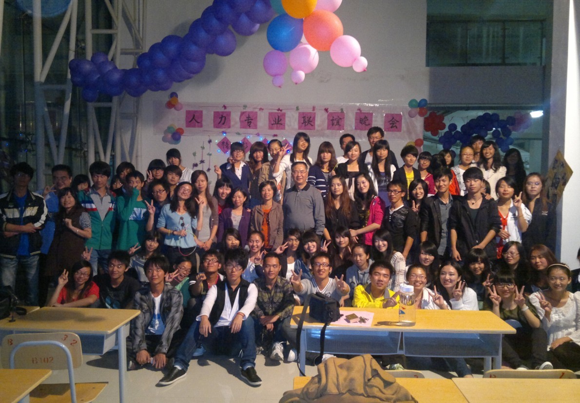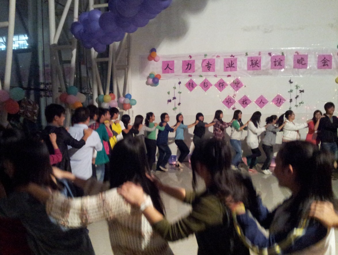 为了丰富了课余生活,给同学一个展示自我,锻炼自我,的机会。2011年10月27日我系人力专业在“求真楼”举行了迎新联谊晚会。本次晚会不仅提升了同学们的胆量,也增进了人力专业各年级段之间友谊。晚会间,游戏环节节目不乏创意,内容丰富,同学参与度高,趣味性强。系党总支书记赵公弼、教师支部书记吴家林、学生支部书记周建辉、办公室主任龚梓斌等领导的参与,使节目的水平得以提升,气氛热烈。最后的集体舞蹈,将气氛推至高潮。