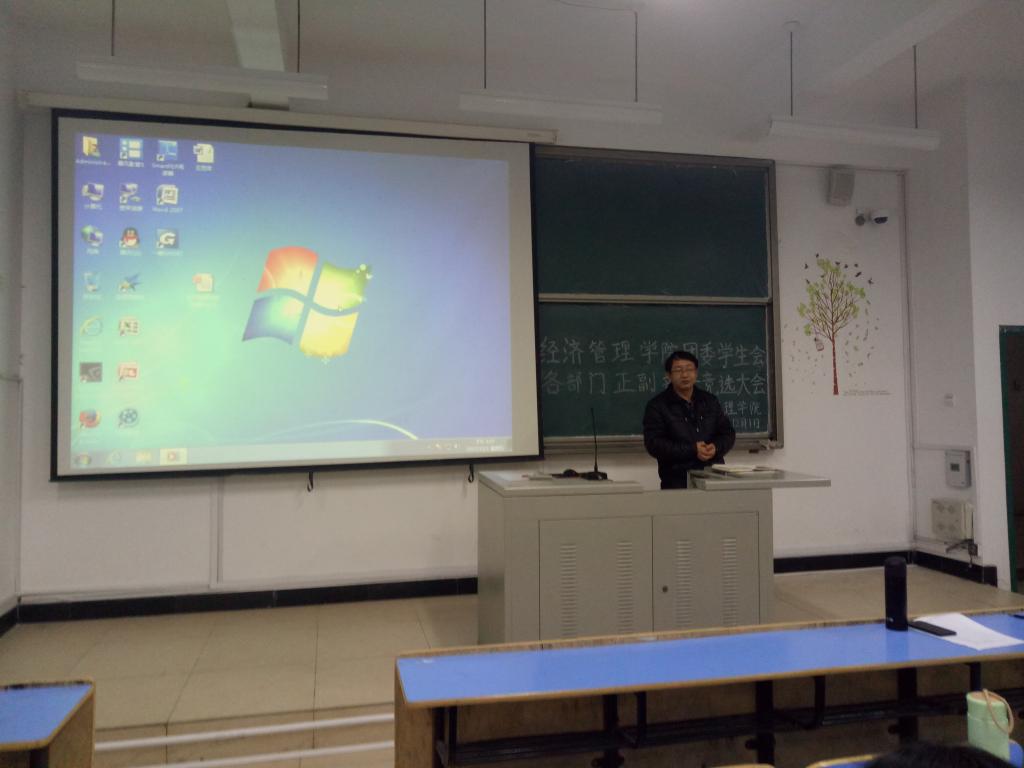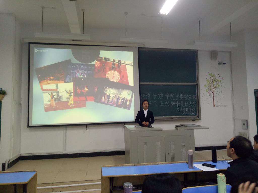 为把优秀的学生工作人才选拔到团委、学生会中来,促进经济管理学院团委学生会工作更好地开展,经济管理学院分别于12月1日、12月5日举行团学各部门正副部长和团委、学生会主席团竞选大会。经济管理学院党委书记郑立文、党委副书记陈新柯以及学生办公室副主任王佳佳、辅导员杜艳芳、邱文君、吴玉芳出席并担任两次大会的评委,团委、学生会多名学生干部参加会议。