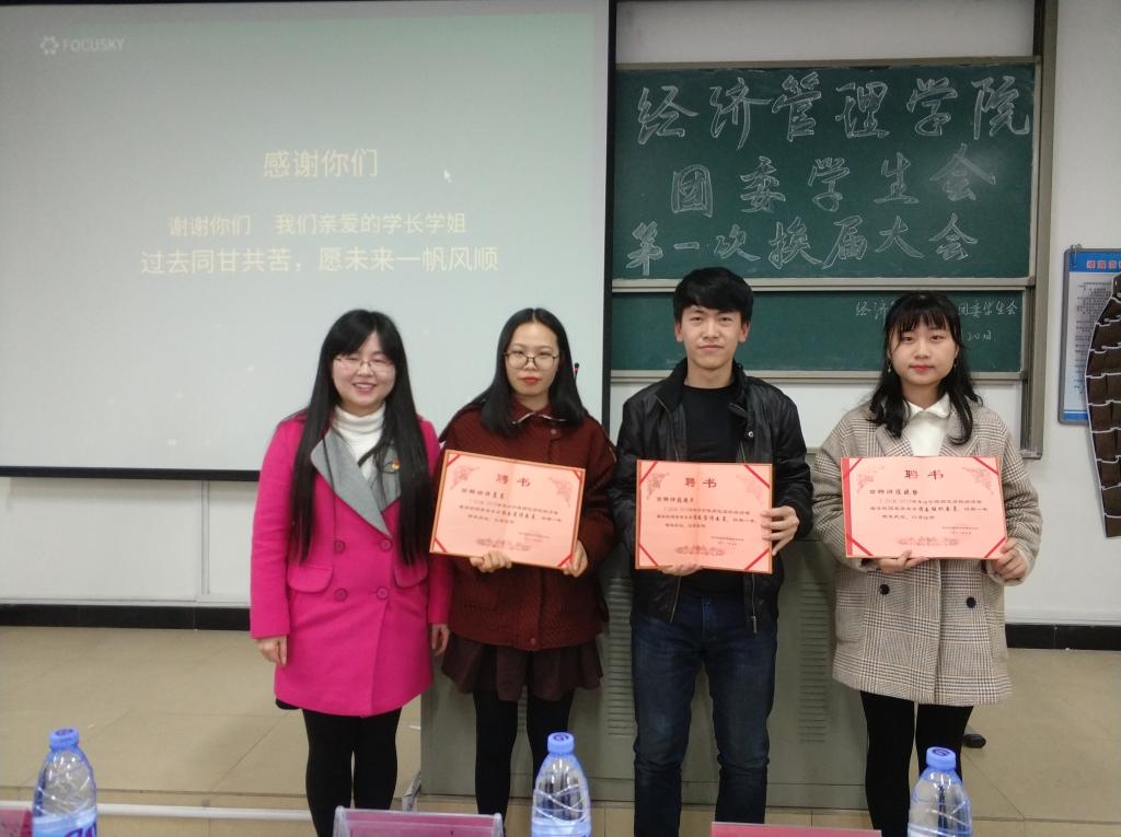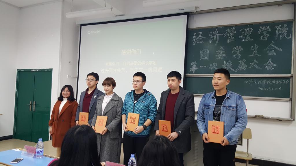 3月20日下午,经济管理学院团委学生会在求真楼召开2017--2018第二学期期初工作会议。大会分为 “老师寄语”、“感谢你们”、“分享与感恩”、“工作报告”和“合影留念”五个环节。王佳佳、吴玉芳、毛明娟、杜艳芳四位老师分别为我院上一届学生干部颁发荣誉证书并合影留念。卸任的主席团成员通过自制短视频分享了自他们加入学生会以来的收获。从迎新晚会到运动会,再到酒店服务技能大赛,一个个活动展现了学生干部们出色的组织能力和协作能力。新主席团成员也纷纷表示将不负老师和同学的信任与期望,努力工作,力争上游。