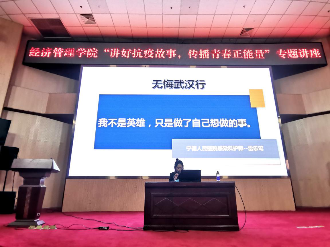 10月14日上午,经济管理学院在图书馆报告厅举办了关于新冠肺炎防控知识培训和“讲好抗疫故事、传播青春正能量”专题讲座。宁德人民医院党委委员、临床支部书记邹国平主任医师,奔赴武汉抗疫一线的全国三八红旗手、宁德人民医院感染科副护士长雷乐莺应邀为2020级416名新生开展了新冠肺炎防控知识培训,宣讲抗疫故事。
