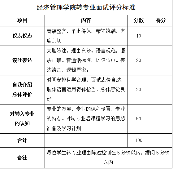 2.每个考生总的面试时间为10分钟。第一个环节为自我介绍(5分钟),考生简要介绍自己接受教育的情况和学业情况,以及选择转专业的原因;第二个环节为问答环节(5分钟),由经济管理学院面试专家组针对学科专业问题向考生提问,由考生作答。