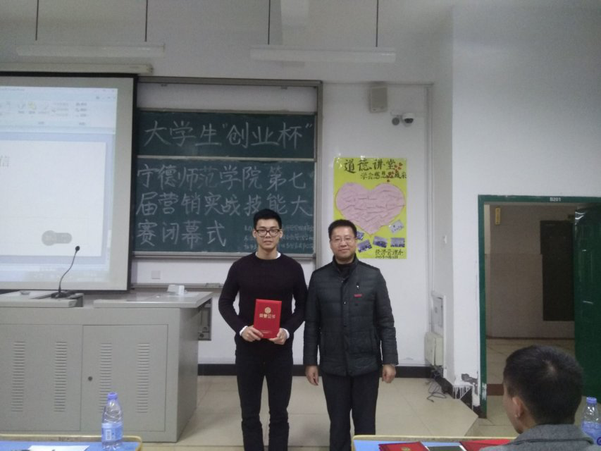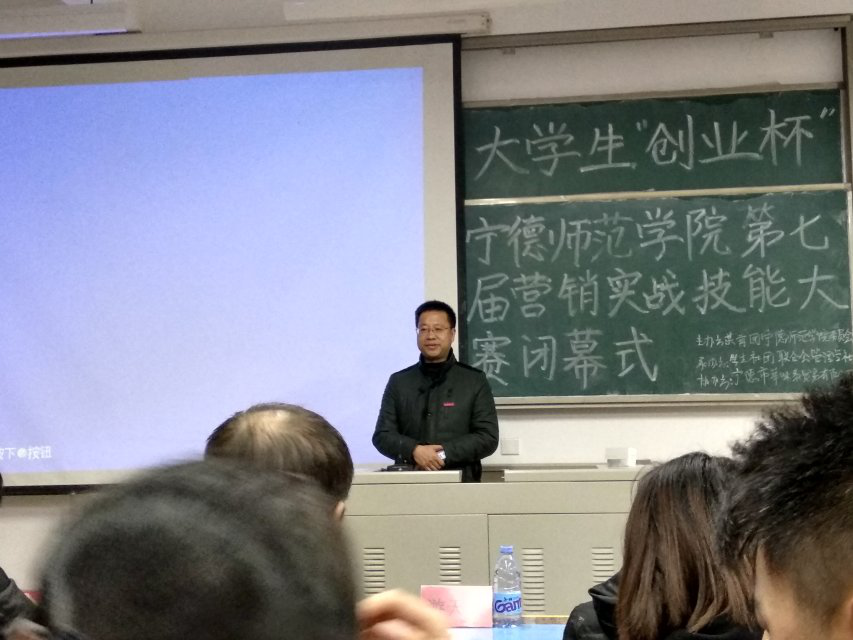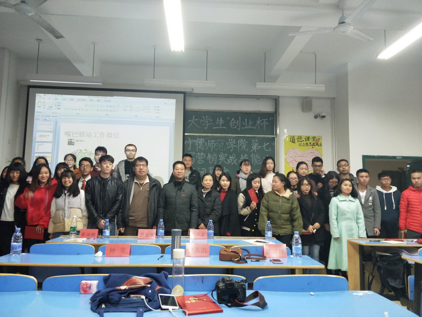 宁德师范学院第七届“创业杯”营销实战技能大赛决赛于2017年12月22日晚上在东侨校区求真楼举行。担任此次活动的评委有经济管理学院院长游国斌教授、市场营销系主任游天嘉副教授、创新创业教研室主任储苏凯老师、蔡尚德副教授、辅导员王佳佳老师、管理学社指导老师欧洋婷老师,以及本次大赛赞助商、宁德市莘味泰贸易有限公司负责人、2016级市场营销2班钟立同学。