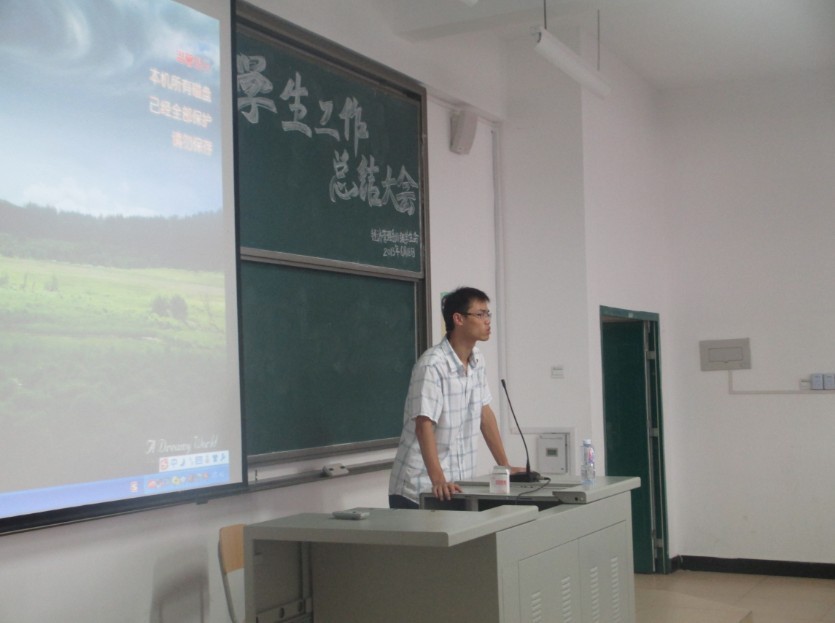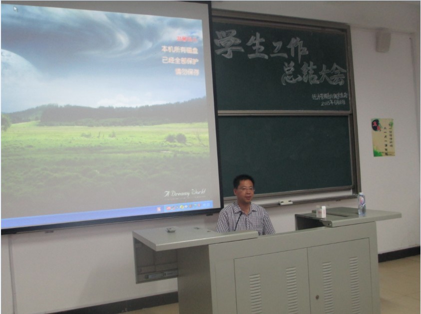 2013年6月18日下午三点半,我系在BB301召开了本学年的学生工作总结大会。出席此次会议的有系党总支书记游国斌教授,学生党支部书记储苏凯老师和我系专职辅导员王佳佳老师及全体学生会成员。