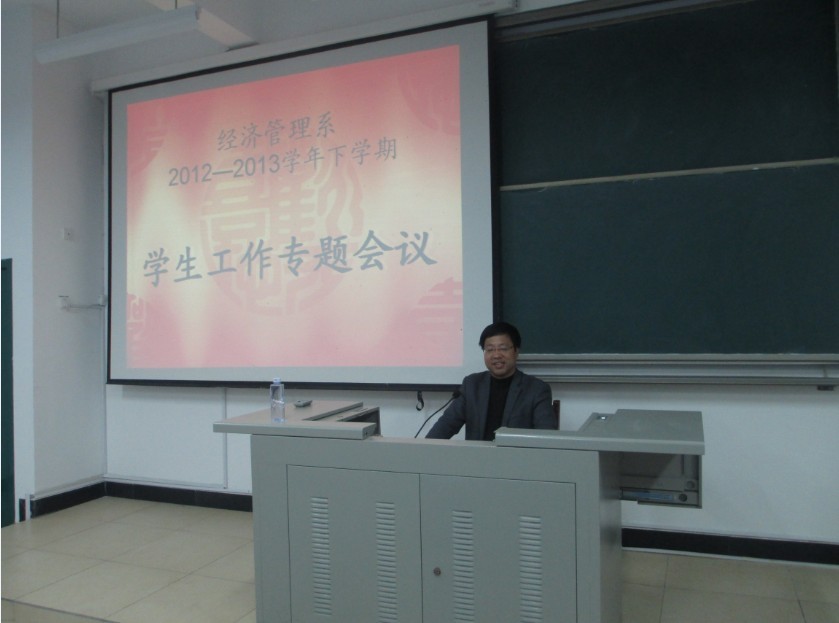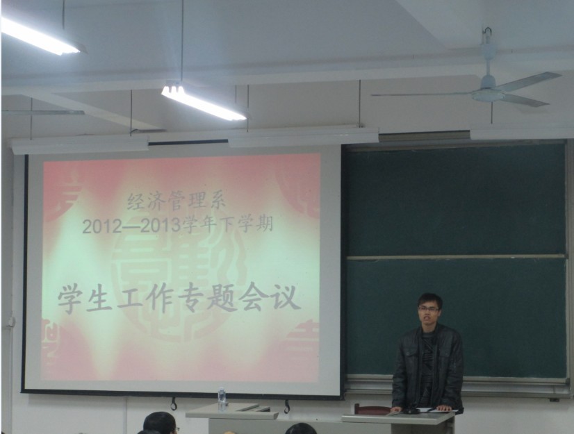 2013年3月8日晚上7:00经济管理系在求真楼B-B101召开本学期第一次学生工作会议。参加会议的有系总党支书记兼系主任游国斌老师,系学生支部书记储苏凯老师,辅导员王佳佳老师。会议由学生会主席主持。