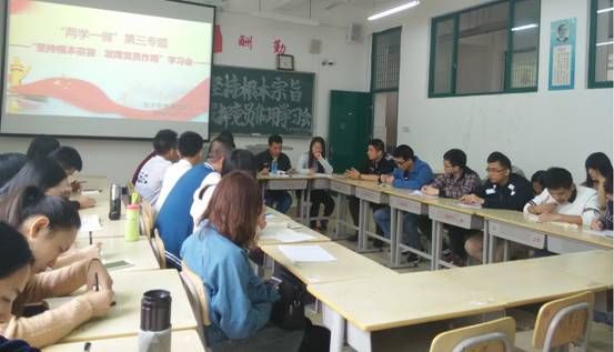 邱文君老师阐述了中国共产党全心全意为人民服务的根本宗旨的内涵,他指出,“坚持根本宗旨,发挥党员作用”就是要求党员弄明白共产党“为了谁、依靠谁、我是谁”,并分享了习总书记七一讲话——“不忘初心,继续前进”的要点,希望学生党员勿忘五个初心,深入群众,帮助班级同学,时刻完善自我、提高自我,从根本上做到全心全意为人民服务。与会期间,学生党员代表发言,表示学生党员要发挥优先带头作用,从思想上、工作上、生活上等方面严格要求自己,为班级同学服务。