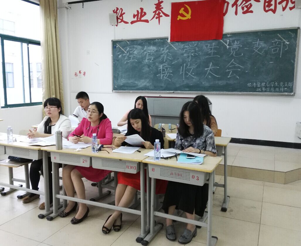 2016年5月11日下午5点,经济管理系于求真楼Bb304召开预备党员转正党内外群众讨论大会和思想汇报会、学生党员转正大会、接收预备党员大会以及两学一做学习教育活动动员会议。出席会议的有经济管理系党务秘书兼学生支部书记周俪老师、系团委书记王佳佳老师、袁曦和孙锴老师、2名学生正式党员、11名学生预备党员、12名发展对象以及4名党外群众。