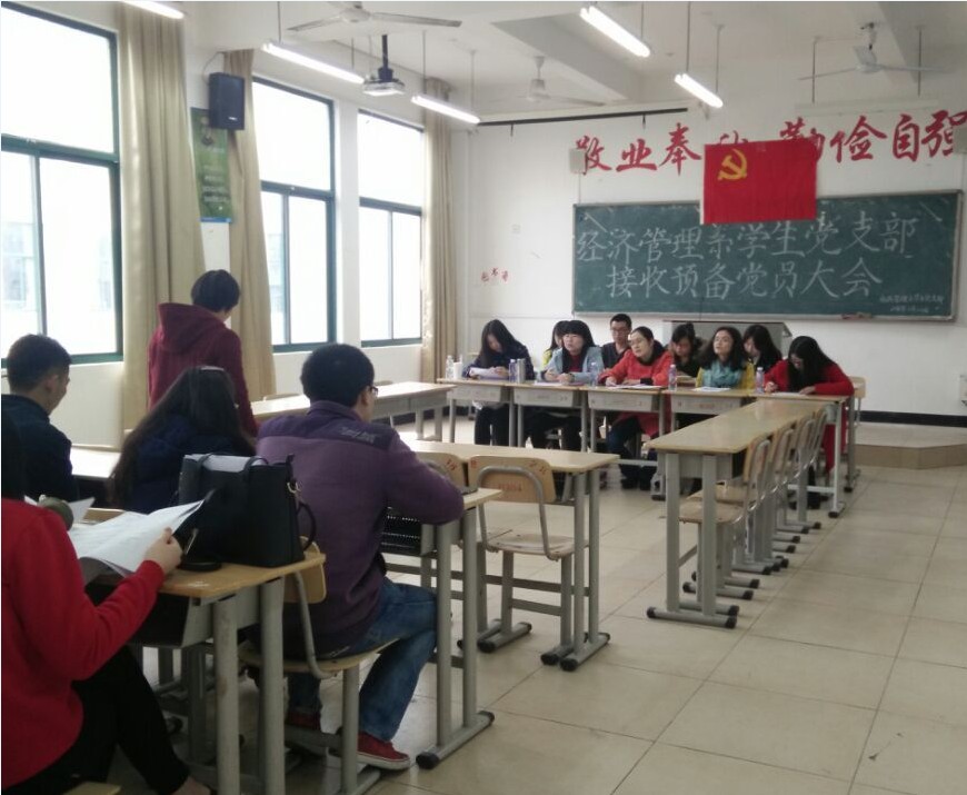 2016年3月22日下午16:00,经济管理系学生支部于求真楼Bb304召开接收预备党员大会。本次会议的议题是经管系学生支部接收李纬雁1名入党积极分子为预备党员。出席此次会议的有经济管理系党务秘书兼学生支部书记周俪、系团委书记王佳佳、专职辅导员杜艳芳等党员老师。会议由周俪老师主持,王君瑶同学负责记录