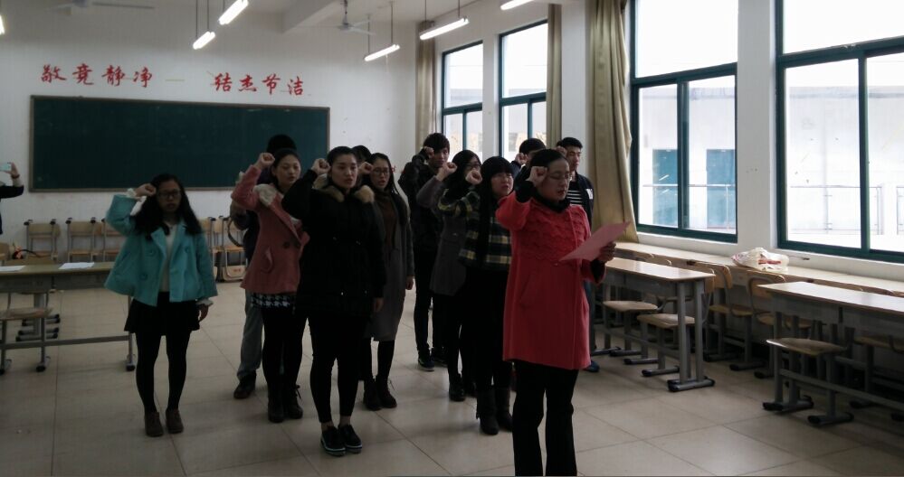 2015年12月14日下午经济管理系学生党支部接收预备党员大会在求真楼BB304教室开展。本次会议的议题是经管系学生支部接收连豪杰等8名入党积极分子为预备党员。出席此次会议的有经济管理系党务秘书兼学生支部书记周俪、系团委书记王佳佳。周俪老师主持会议,王君瑶同学负责记录