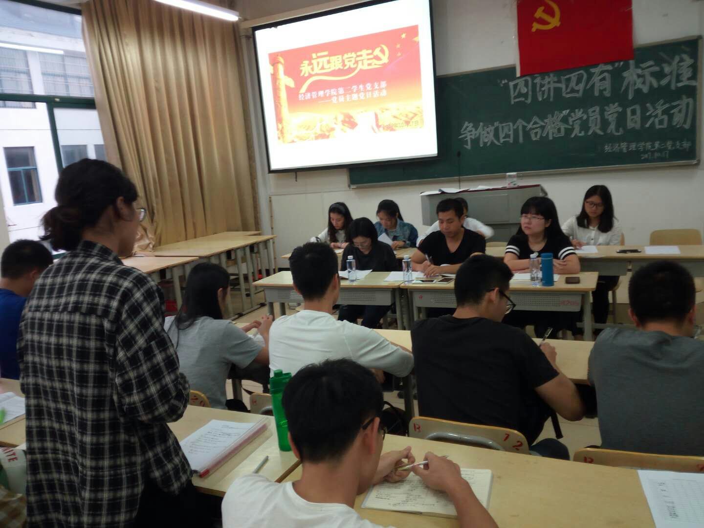 2017年10月17日下午,经济管理学院学生第二党支部在求真楼开展践行“四讲四有”标准,争做“四个合格”党员的主题党日活动。本次活动由学生第二党支部书记邱文君主持,其他教师党员以及各班正式党员、预备党员、积极分子参加本次活动。