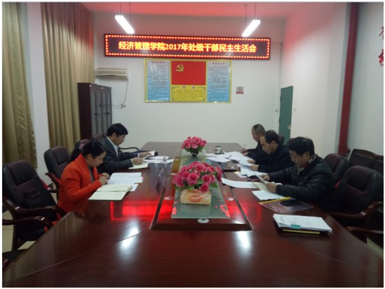 2018年1月26日下午,经济管理学院党委在求真楼召开2017年度处级党员领导干部民主生活会,民主生活会的主题为认真学习领会习近平新时代中国特色社会主义思想,坚定维护以习近平同志为核心的党中央权威和集中统一领导,全面贯彻落实党的十九大各项决策部署。校长魏远竹,校督导组成员郭赛玉到会指导。