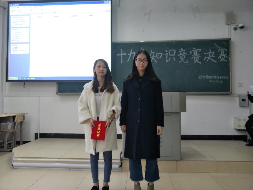 为进一步深入学习贯彻党的十九大精神,经理管理学院团委、学生会于2017年12月12日下午在求真楼举行“十九大知识竞赛(决赛)”。吴玉芳老师应邀出席,并为获奖选手颁发证书。
