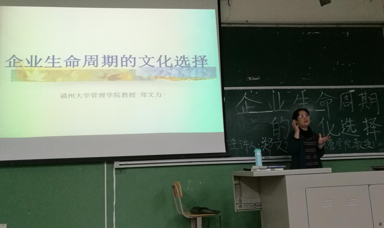 作为学校第八届“科技活动月”的一项活动内容,福州大学经济与管理学院郑文力教授应邀于12月12日下午在蕉城校区21号楼开设“企业生命周期的文化选择”专题讲座。我院游天嘉副教授主持讲座,2017级市场营销、国际商务班的全体同学参加讲座。
