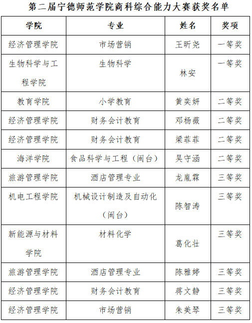 为深入推进创新创业教育,提升学生商业实践能力与综合素养,我院于2026年4月18日在求真楼隆重举办第二届宁德师范学院商科综合能力大赛决赛。经过激烈角逐,最终评选出一等奖2名、二等奖4名、三等奖6名。本次大赛充分展现了选手们扎实的专业知识、敏锐的市场洞察力与出色的经营决策能力,对推动学校商科教学改革和新商科人才培养具有重要意义。